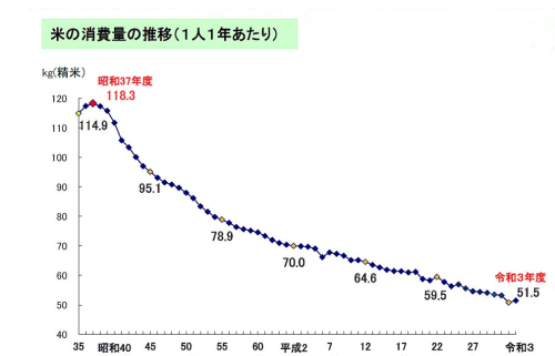 コメが品薄になった要因としては、パンなど食品価格が高騰し割安感のあったコメに消費がシフトしたこと、インバウンドによりコメ需要が増えたこと等が指摘されている。一方で、図に示したごとくコメの消費量は戦後一貫して減少を続け、コメは常に余ってきた。一人当たりのコメ消費量は、1962年度の118㎏から年々減少し、2022年度は半分以下の年間51㎏まで落ち込んでいる。1960年代約1,300万トンあったコメの生産量は、現在約800万トンまで減少してしまった。