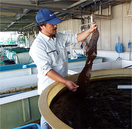 研究所の実験では、マコンブの葉を小片に切断し、深層水の流れる水槽で培養すると、2週間後には遊走子を放出。さらに幼体が20週間で全長3mに成長した。こうして確立したのが深層水を使った通年の陸上連続培養システムだ。2009年に特許出願した。