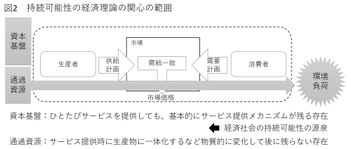 その関心の範囲は、従来の経済理論の関心の範囲の外側にあります(図2)。そこでは、社会経済活動を支える2種類のストック、資本基盤と通過資源を定義し、資本基盤が経済の持続可能性の源泉であるとしています。資本基盤には、人的資本基盤、人工資本基盤、自然資本基盤、社会関係資本基盤の4種類があります。エネルギーや原材料といった通過資源を使用すると必ず環境負荷が発生し、これが各種資本基盤の持続可能性を脅かす恐れを認識します。