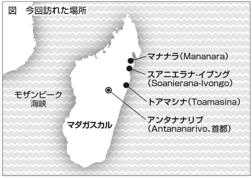 マダガスカルで、私がなかなか足を運べていない場所がありました。そこは、マダガスカルの東海岸に位置するマナナラ(Mananara)という場所です。ここに行くには、トアマシナ(Toamasina)から北に50 kmほどのところにあるフルポアン(Foulpointe)、もしくはさらに北上してスアニエラナ-イブング(Soanierana-Ivongo。長過ぎでいまだにちゃんと覚えられません)という場所から船に乗って1日、もしくはトアマシナからピックアップの四輪駆動の車で2泊3日の道のり。船は天候によって出航日時が読めないので、特に往路は陸路で行くことがファーストチョイスになります。トアマシナから北上する国道5号線は国内でも屈指の過酷な悪路といわれています。2泊3日ですから、往復の移動だけでも1週間かかります。そのためどうしても行くのにちゅうちょしていました。しかし、2023年8月、やっぱり行きたい!と意を決して、マナナラに向かいました。