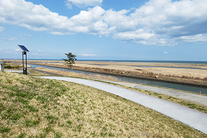熊谷さんと別れると、さらに南へ向かい阿武隈川を渡り、鳥の海公園を経て震災遺構の中浜小学校に到着した。公開時間外だったので離れた場所から校舎を眺めた。震災前から津波や高潮への対策が施されていた校舎が児童や教職員、保護者ら90人の命を守ったことを後で知った。