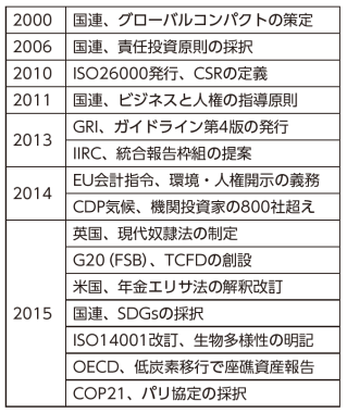 国連主導により1972年のストックホルム宣言で「地球環境」を認識し、1987年のブルントラント委員会報告で「持続可能な発展」が定義され、1992年には世界初の地球サミットがブラジルのリオデジャネイロで開催された。他方、OECDは1976年に、責任ある企業に期待される多国籍企業行動指針を策定した。