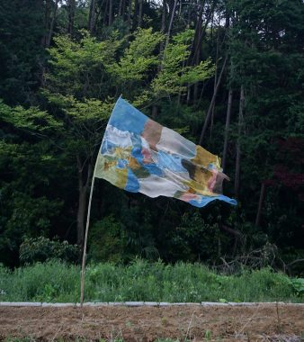 制作中、山本の創作姿勢は変化した。「以前は布に細かく絵を描き、完成形をコントロールしていました。でも今は自然や偶然に任せた方が、意図を超えた表現が生まれ、面白いと思っています」。谷間に掲げられた「あわいのはた」は人工物でありながら、周囲の山林や土と切り分けられない状態で存在している(写真)。布は固定された形を保たず、風や湿度、地形の条件によって常に変化する。